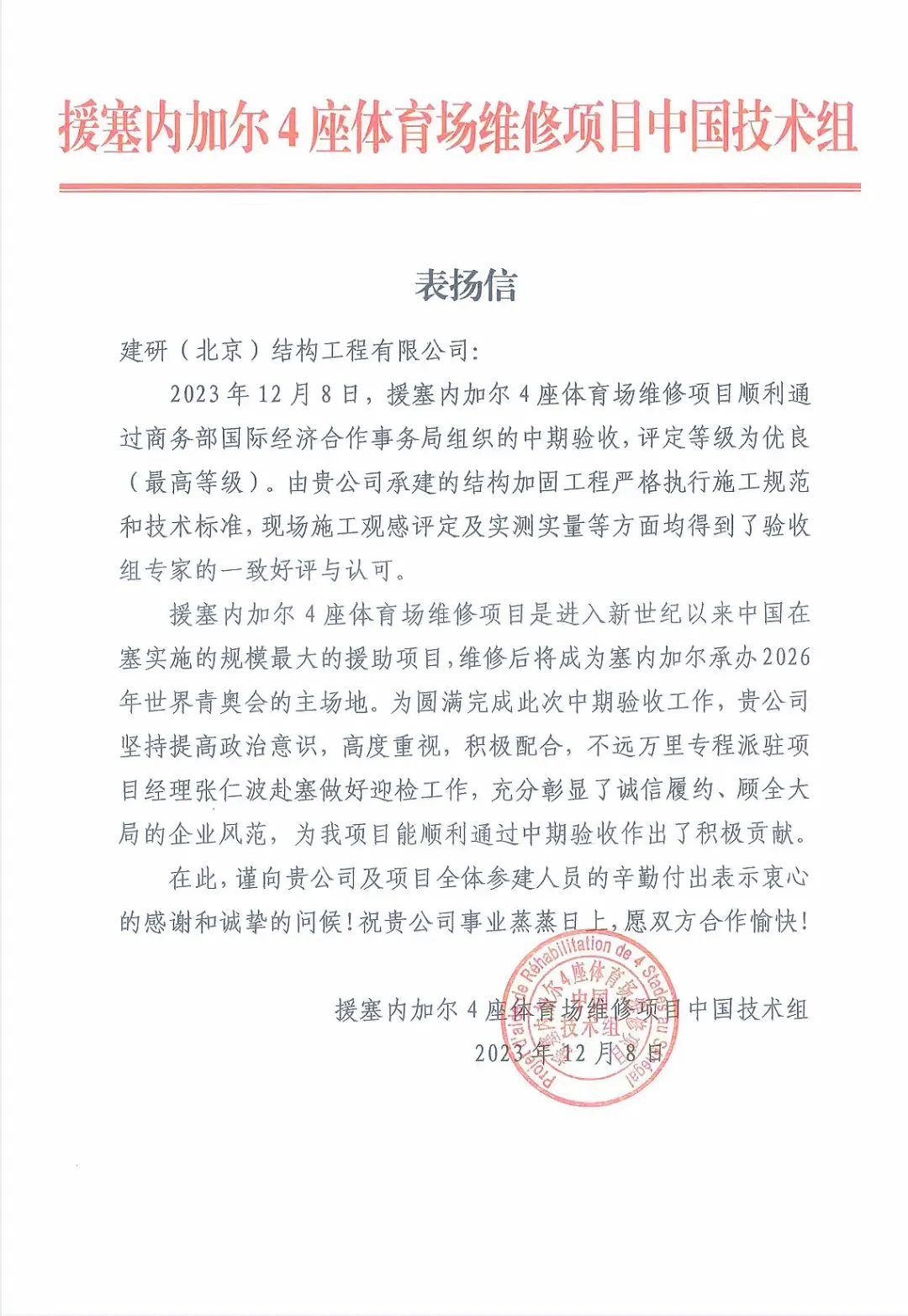 信中表示,為圓滿完成此次中期驗收工作,貴公司堅持增強政治意識,高度重視,積極配合,不遠萬里專程派駐項目經理張仁波赴塞做好迎檢工作,充分彰顯了誠信履約、顧全大局的企業風范,為我項目能順利通過中期驗收做出了積極貢獻。