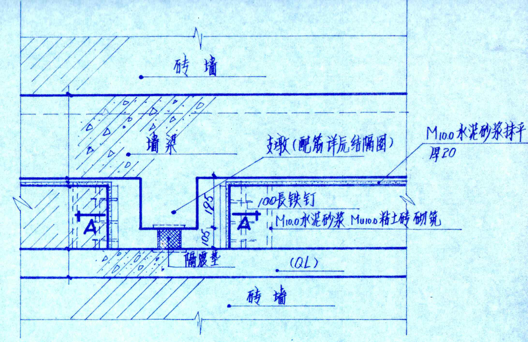 ?隔震縫沿豎向300mm,上部為上墻梁,下部為磚墻頂部圈梁或鋼筋混凝土墻頂。