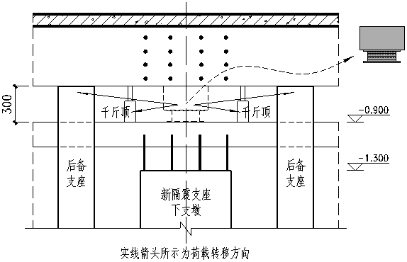 新支座上、下支墩混凝土達到設(shè)計強度,緩慢移除千斤頂。由千斤頂及后備支座共同承擔(dān)的荷載轉(zhuǎn)移至由新隔震支座及后備支座共同承擔(dān)。