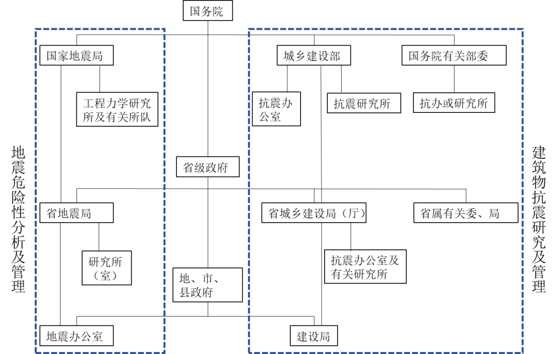 (7)?到了1980年代末,我國地震工作系統主要由國家、省(直轄市、自治區)、地(市)、縣等各級地震局構成,抗震工作系統主要由建設部、省(直轄市、自治區)、地(市)、縣等各級建設行政主管部門的抗震辦公室構成,二者的行政職責與分工是明確的,有機地組成了我國抗震防災組織系統(圖1)。