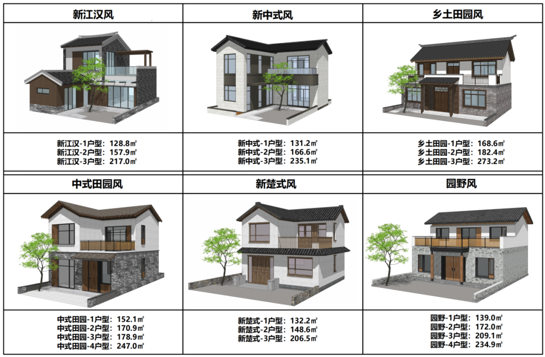 按照“功能現代、結構安全、成本經濟、綠色環保、與鄉村環境相協調的宜居住房”的總體目標,在試點示范建設中,根據其他不同村灣的特點,和未來閑置農房改造民宿的需求,設計了另外五種不同的建筑風貌,形成《湖北省大冶市現代宜居農房戶型圖集》。
