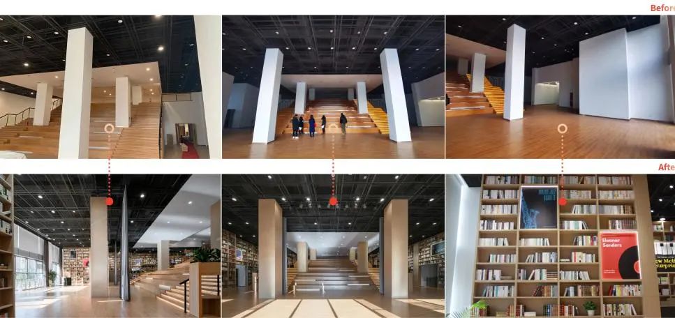改造設計團隊提出從建筑外立面、建筑前廣場、室內空間、標識等多維度的空間更新策略。建筑外立面延續原有建筑的樣貌,根據置入內容的變化更新門頭及廣告招牌等。
