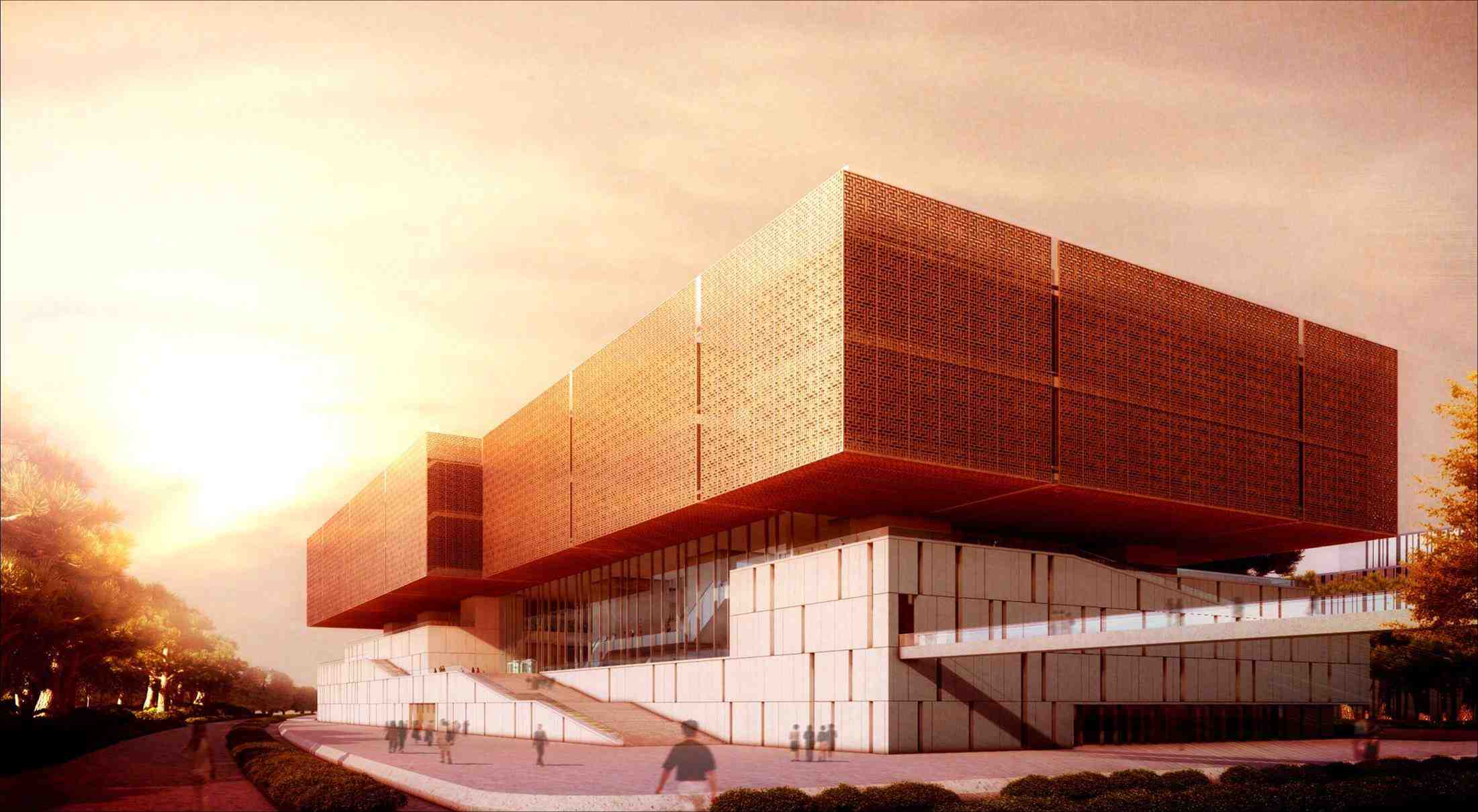 建筑下部為堅(jiān)實(shí)穩(wěn)重的實(shí)心體基座,上部造型為“凌空的藏寶閣”,外覆中國傳統(tǒng)圖案的格柵。位于“藏寶閣”內(nèi)的“百寶箱”的設(shè)計(jì)構(gòu)思與靜態(tài)、動(dòng)態(tài)展示區(qū)所展示的中國傳統(tǒng)工藝美術(shù)珍品相呼應(yīng),寓意形象而鮮明。展廳的空間面積也各不相同,可以滿足不同藝術(shù)作品的布展需要。