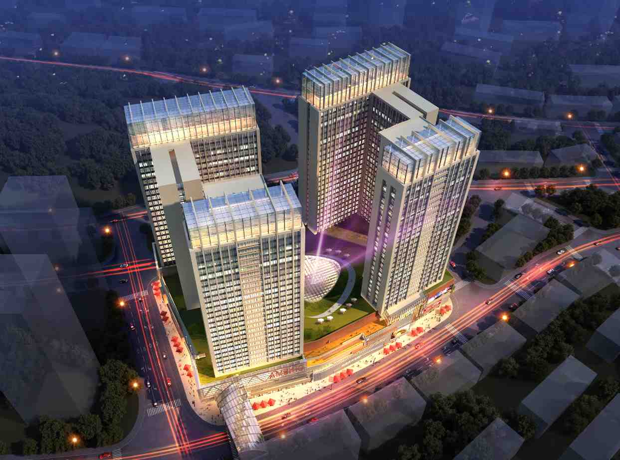工作內容:全過程改造設計。該項目改造前為四棟圍合式商貿綜合樓,地下一層,地上七層,建筑高度31.80m,改造前建筑設備設施老化,商業價值不足。改造后將現有建筑作為裙樓底商,在四角加建四棟110m高的酒店式公寓。