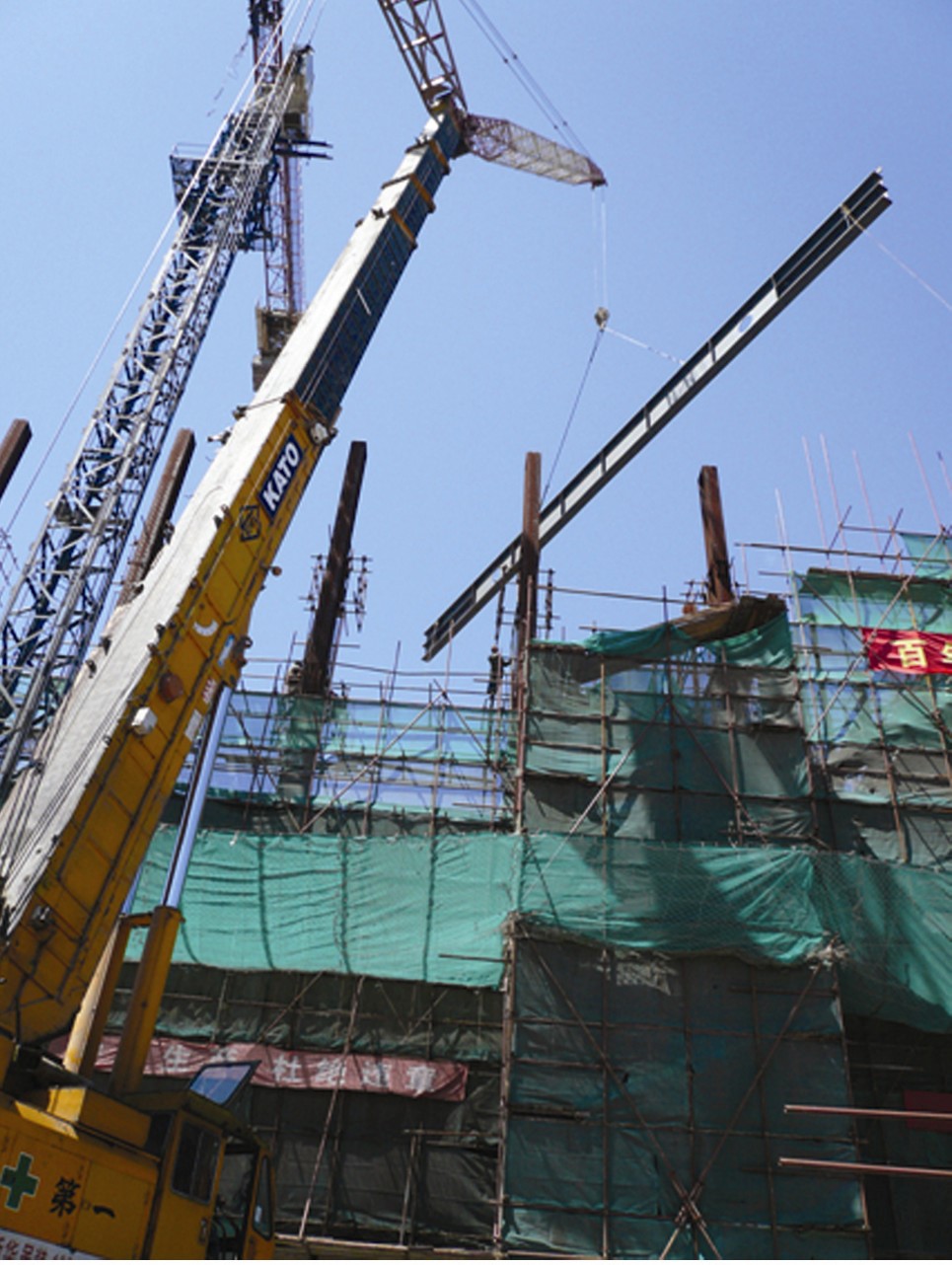 鋼結構施工。主立柱6m×34m,總高度32m,長66m,兩層為33m跨鋼梁,一層為33m跨網架。